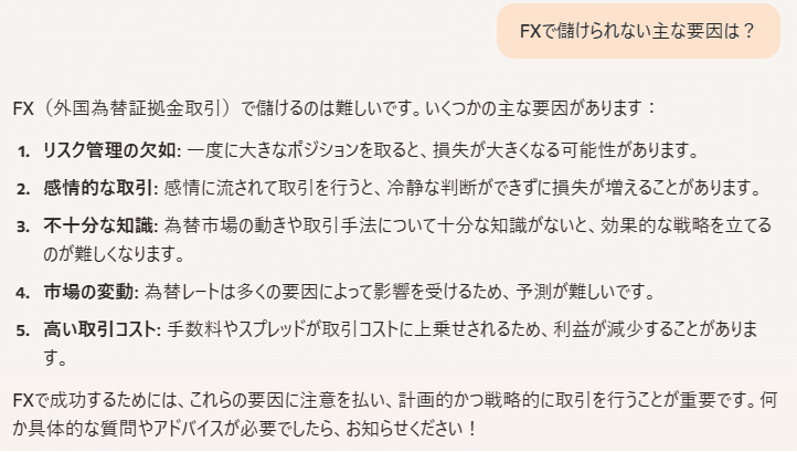 生成AIツールCopilotに聞いてみた!「FXで儲けられない主な要因は?」